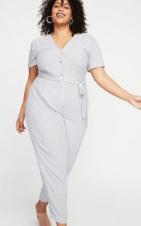 This last look is super cute! I am loving jumpsuits lately and this one is so darling! It has a V-neck. Short cuffed sleeves. Three-button front. Hidden interior No-Peek buttons at the bust means nothing shows that shouldn't. Seamed waist, with comfortable elasticized back waist and removable tie. belt. Covered zip fly. Soft, lightweight rayon/linen blend, with contrasting vertical stripes. This jumpsuit is only $30.